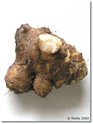 Pflanze aus der Familie der Korbblütler (Asteraceae), die zur selben Gattung wie die Sonnenblume zählt und auch als Rosskartoffel, Erdartischocke; Erdbirne oder "Diabetikerkartoffel" bekannt ist. Die Pflanze kam Anfang des 17. Jahrhunderts aus Nordamerika nach Europa, wird bis zu drei Meter hoch und vermehrt sich vegetativ über die Wurzelknollen. 100 Gramm Topinamburknolle enthält etwa 14 mg Kalzium, 3,4 mg Eisen, 4 mg Natrium, 2 mg Vitamin A (RE) und 4 mg Vitamin C. Sie bestehen aus etwa 78 % Wasser, 2,4 % Eiweiß, 0,4 % Fett, 17,4 % Kohlenhydraten und 1,6 % Ballaststoffen. Außerdem enthalten sie bis zu 16% Inulin, auch Kompositen- oder Alantstärke genannt. Sie wird im Magen von Enzymen und Säure in Fruchtzucker aufgespalten, der für Diabetiker verträglich ist - weshalb sie auch "Diabetikerkartoffel" genannt wird. Inulin wird in vielen Pflanzen als Reservestoff eingelagert, besonders in Arten der Korbblütler wie Gewöhnlichen Löwenzahn und Schwarzwurzeln, aber auch in Doldenblütlern wie z.B. der Pastinake. | |||||||||||||||||||||||||||||||||||||||||||||||||||||||||||||||||||||||||||